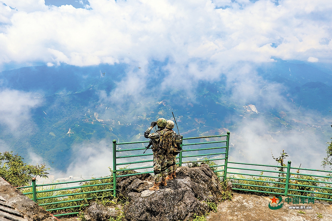 官兵巡逻途中观察边情。