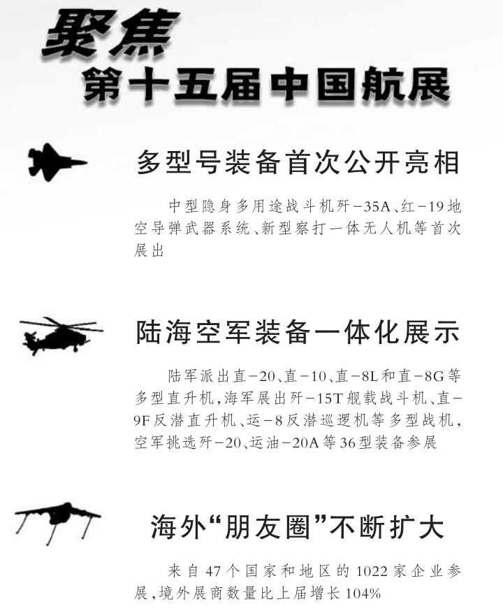 11月12日,第十五届中国航展在珠海开幕。万众期待的歼-35A战机首次亮相,歼-20战机以全新姿态振翅长空,红-19地空导弹武器系统、新型察打一体无人机等装备首次公开展示,空军八一飞行表演队、空军航空大学“红鹰”飞行表演队劲舞苍穹……中国航展这个愈加开放的平台,集中展示出跨入战略空军门槛的人民空军,以开放的姿态、自信的表现,飞出迈向世界一流的新航迹。