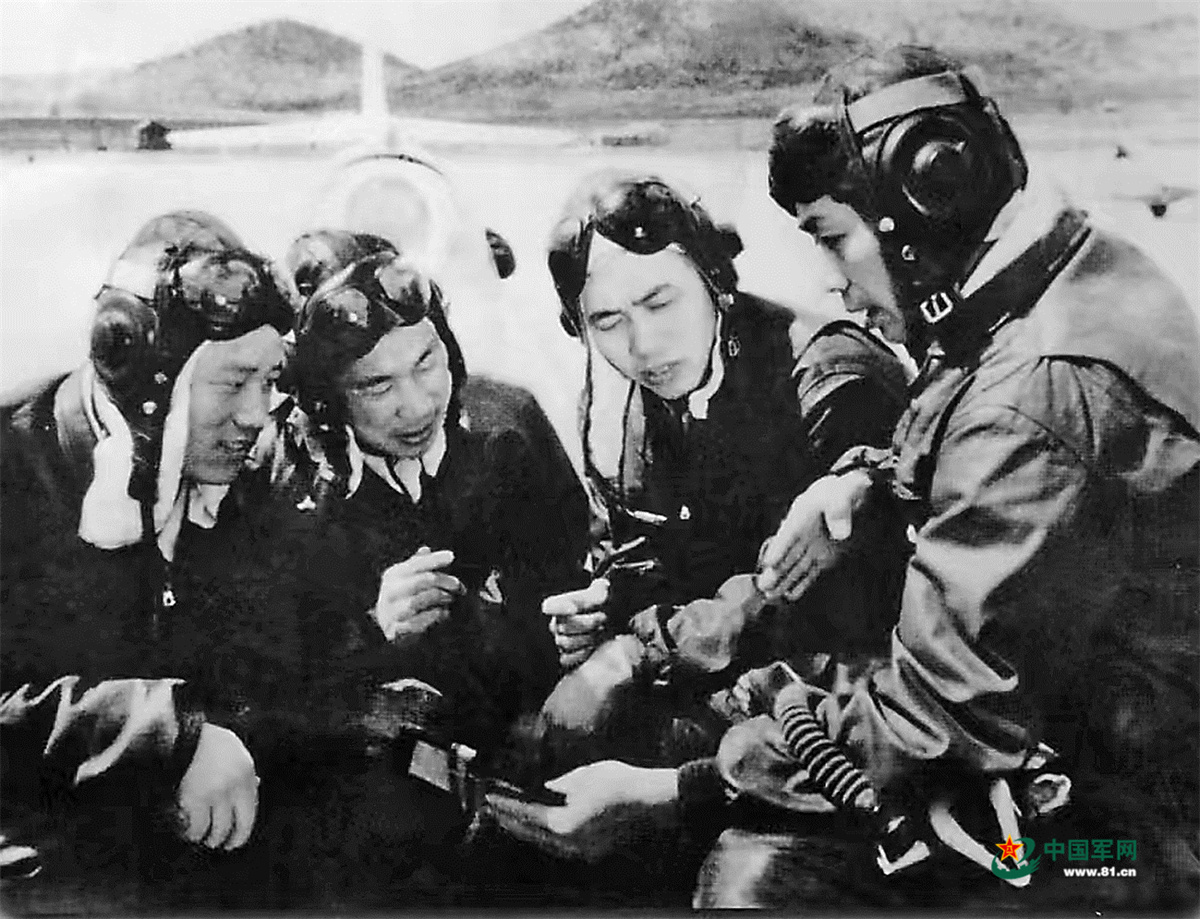 “空中神炮手”鲍寿根(右一)与“神炮中队”飞行员交流。资料图片