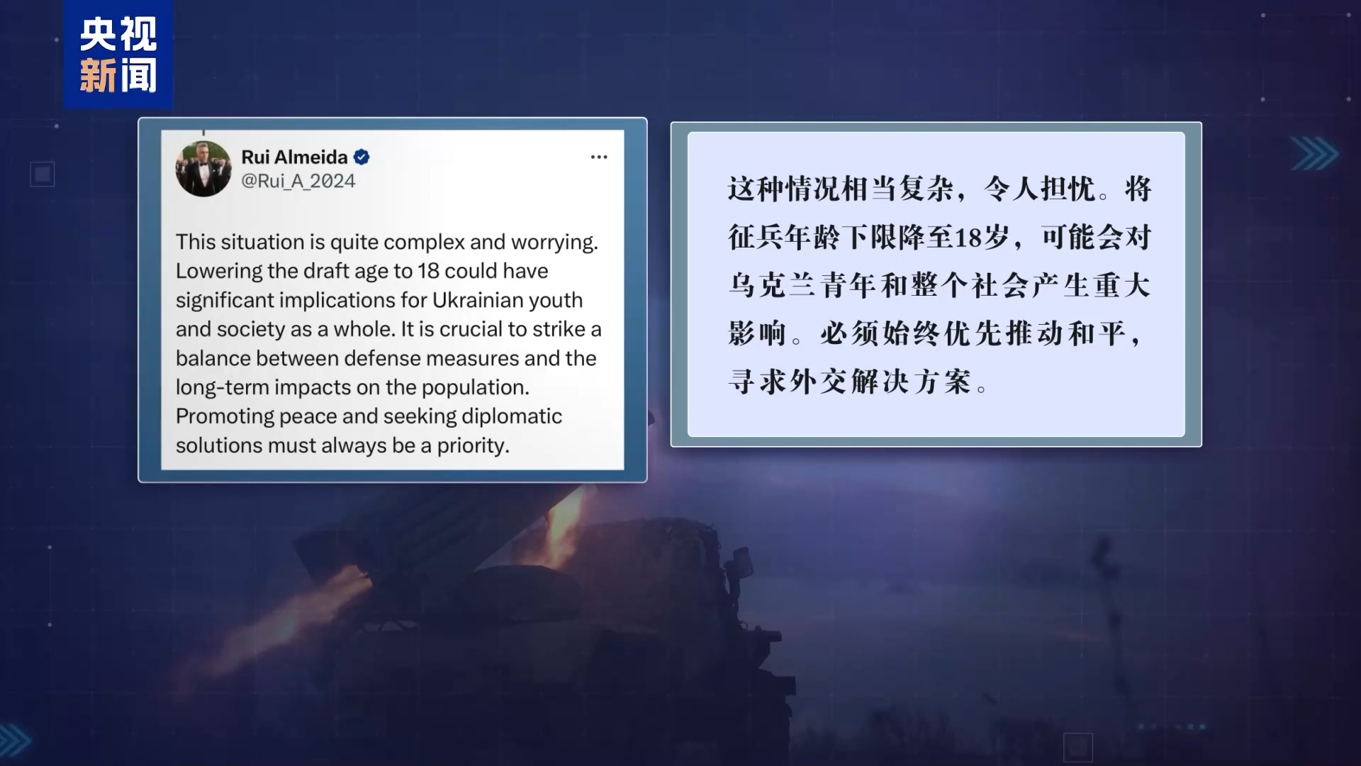 总台记者 魏东旭:但是如果把征兵的年龄从25岁降低到18岁,会在社会层面引发更多的不满和动荡,那乌克兰政府和乌克兰军队可能会面临更多来自内部的压力。而且一旦把征兵的年龄降低到18岁这样的一个水平,这就意味着很多正在读大学的乌克兰年轻人可能就要被迫上战场。可以说现在乌克兰方面,尤其是乌克兰军队已经是左右为难。如果不降低征兵年龄,北约可能会在援助武器装备的问题上为难乌克兰;但是如果降低了征兵的年龄,国内的反对质疑的声音也会越来越大,这对于民心和军心也会产生负面影响。