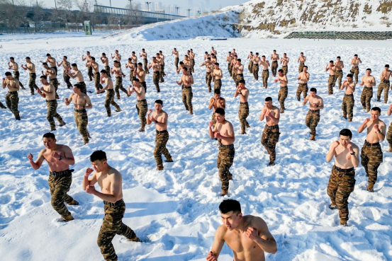 近日,乌鲁木齐气温降至-20℃,在冰雪地的严苛环境中,武警新疆总队某支队的官兵毅然脱掉上衣进行抗寒训练,有效提升了官兵对寒冷环境的适应能力和坚韧的战斗意志。(赵炎明、李杨、张新、蔡季存、董虎)