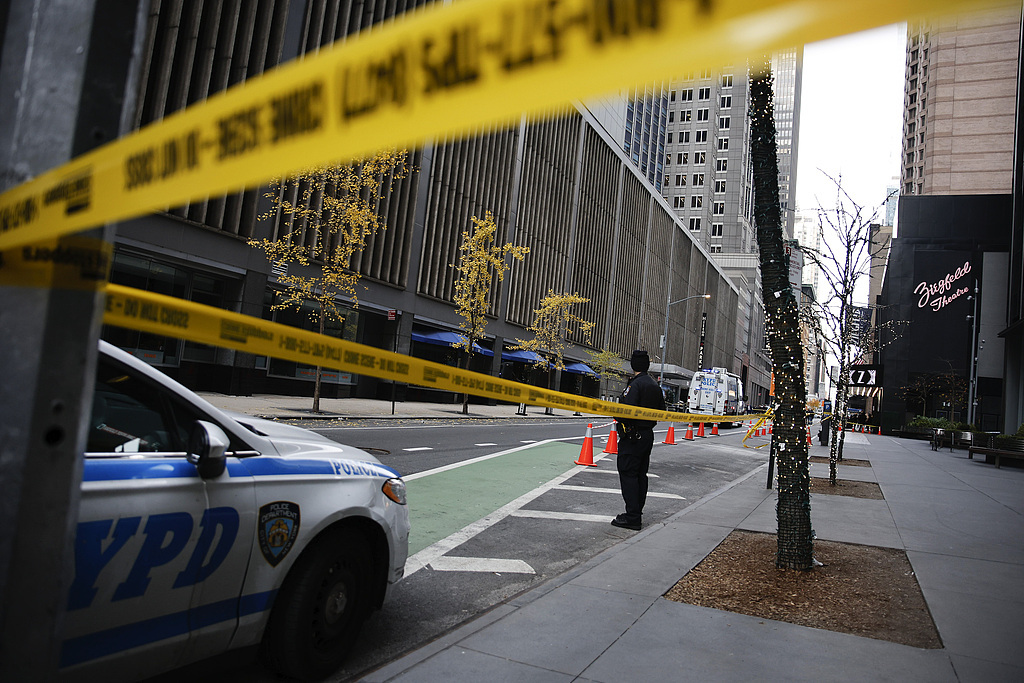12月4日,美国纽约,曼哈顿中城区希尔顿酒店外发生一起枪击事件。美国联合健康集团旗下联合健康保险公司首席执行官(CEO)布莱恩·汤普森遭到致命枪击。(视觉中国)