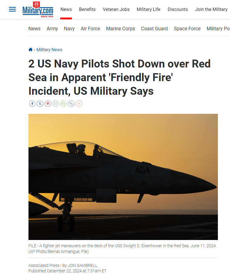 每日军事新闻网称,这是一起“友军误击”事件,是打击也门胡塞武装一年多以来对美军构成威胁的最严重事件。美国福克斯新闻网24日独家消息披露,“误击”事件发生当天,另有一架美军F/A-18战机险些遭遇同样的命运。
