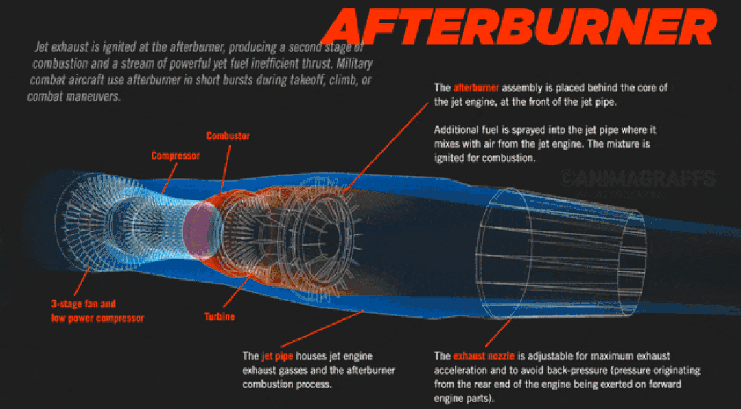 现代军用航空发动机通常有前后两个燃烧室。第一个燃烧室在正常状态下一直处于工作状态,维持着整个发动机的正常运转,并提供多数情况下足够的常规推力。在这种状态下,战斗机通常不会形成能被肉眼看见的明显尾焰。