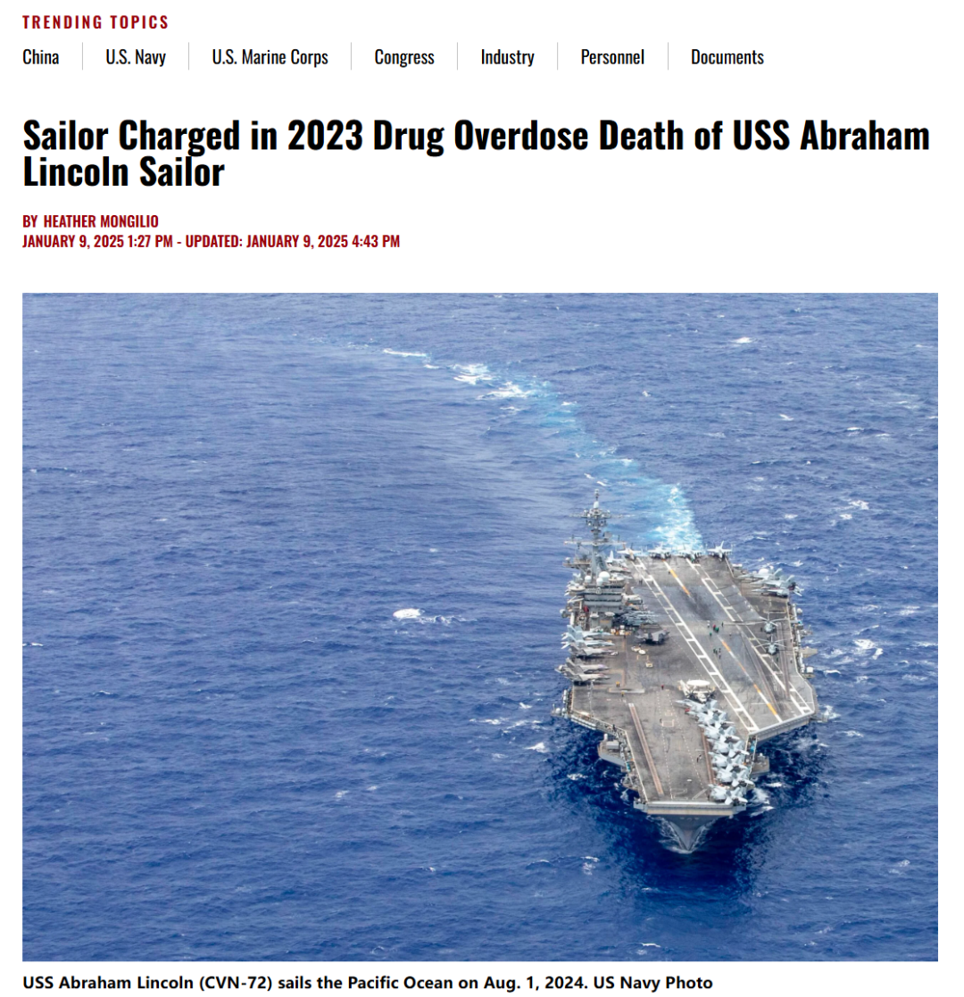 2023年,“亚伯拉罕·林肯”号航母上一名水兵外出度假时猝死,尸检结果显示该水兵死前曾过量吸毒。10天后,该舰另一名水兵也因吸食毒品过量被送院抢救。两起案件引起了美国海军犯罪调查局的关注。
