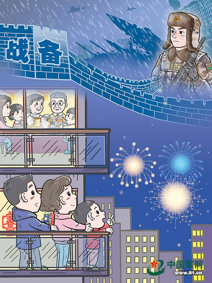 去年春节,某网站“你为何能安心过年”的答案征集中,这样一条跟帖刷屏网络——长空之上、湛蓝海疆、千里边关、繁华闹市,人民子弟兵把对人民和祖国清澈的爱,化为深情的守望、坚强的守护,用警惕的目光、坚定的步伐、矫健的身姿,构筑起保卫祖国的钢铁长城。