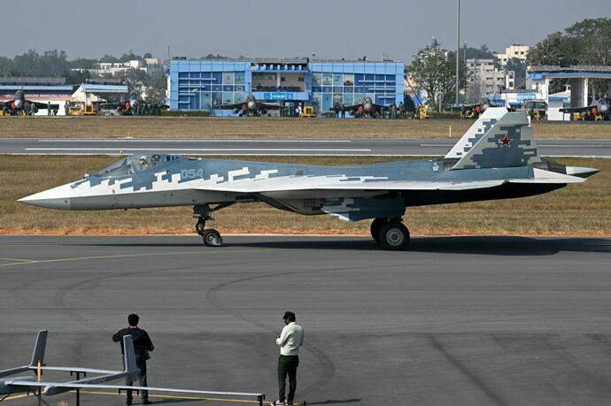 2月10日,在印度班加罗尔耶拉汉卡空军基地举行的第15届印度航展上,俄罗斯苏-57战机在滑行。 图源:新华社