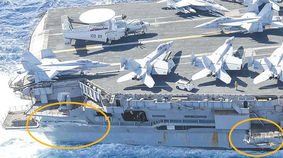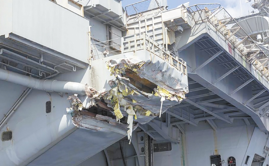 美国海军在事故发生后快速通报称,航母水线以上部位出现破损,但核动力装置安全,没有进水,舰上没有人员伤亡,搭载的战斗机也未受到损伤。“福克斯”网站15日称,美国海军陆续发布的照片显示,该航母右舷升降机后部的舷台有明显撞击痕迹,右舷靠近船尾的地方有一道撕裂,沿着船舷的一根管道似乎也受到了严重损坏。美国海军学会网站称,这些只是航母受损情况的一部分,但“其他部分的受损情况相对更轻一些”。