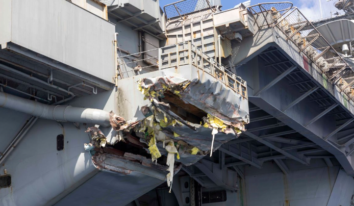 美国海军在给《星条旗报》的另一份声明中称,这些维修工作包括拆除受损的金属部件以及安装防水舱壁。此次碰撞导致“杜鲁门”号右舷后端出现刮痕和裂口,其中一处远高于吃水线的小裂口穿透了舰体。