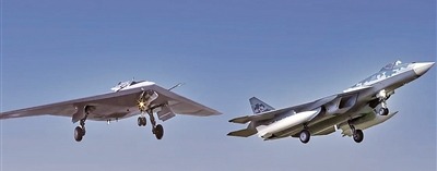 俄罗斯S-70“猎人”无人机(左)与苏-57战斗机协同飞行。