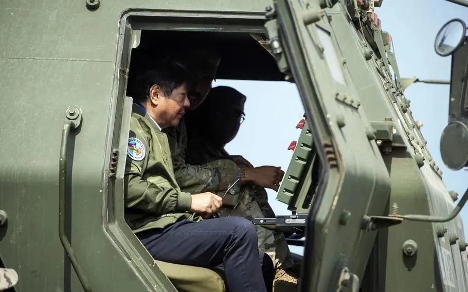 资料图:2023年,菲律宾总统马科斯在美菲“肩并肩”联合军演中登上“海马斯”火箭炮系统发射车
