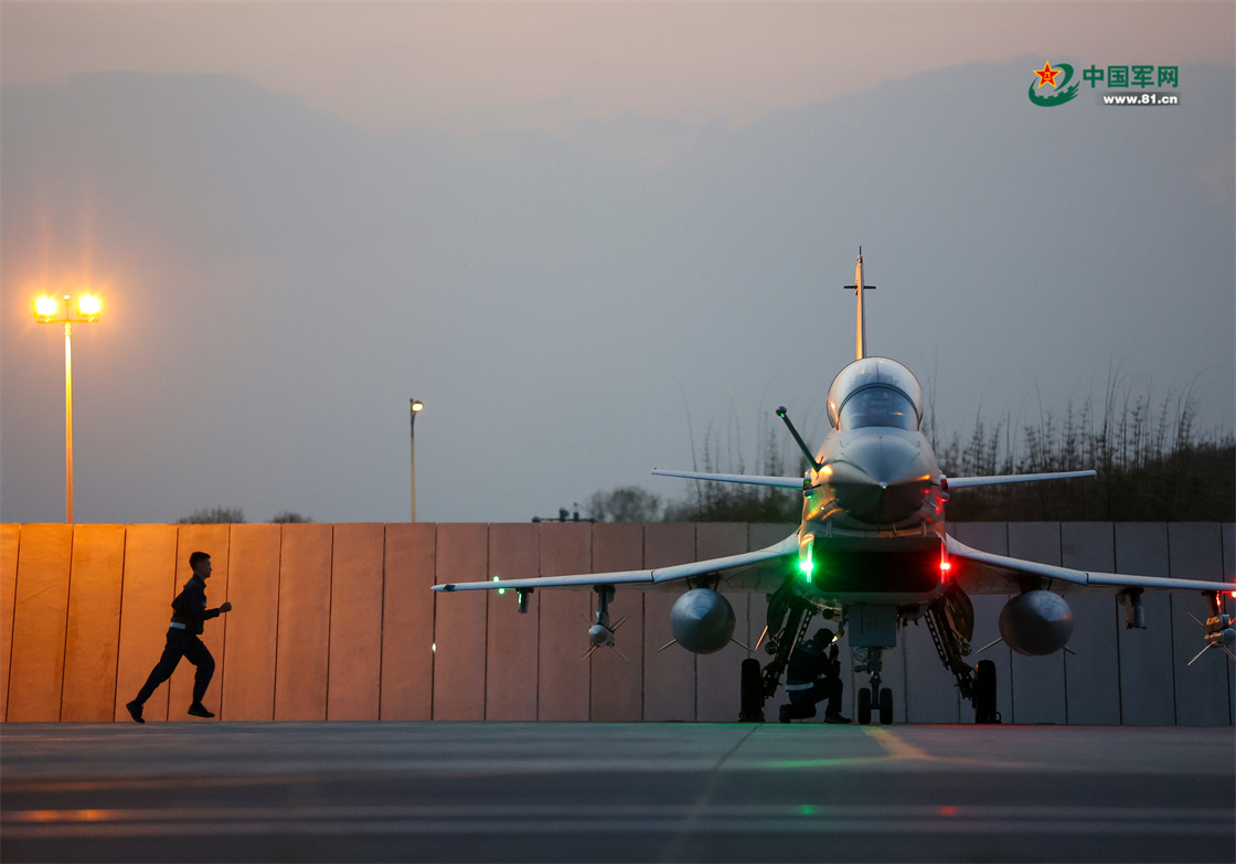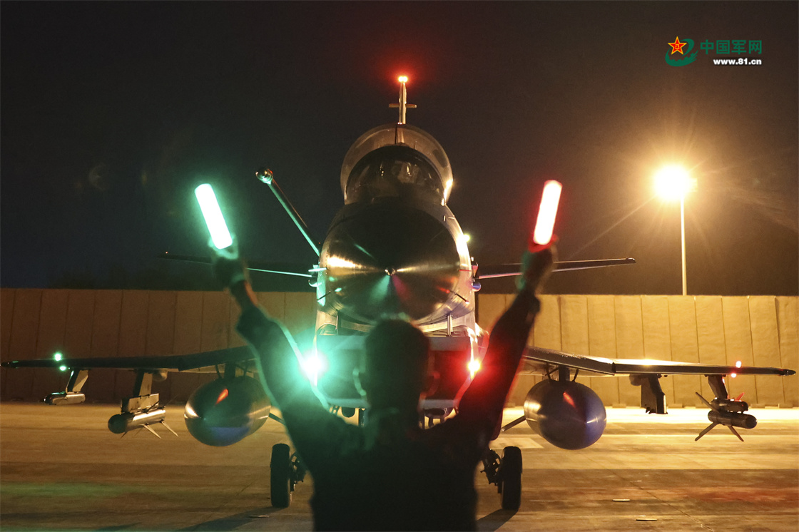 夜航训练结束,机务人员引导战机滑回停机坪。王文 摄