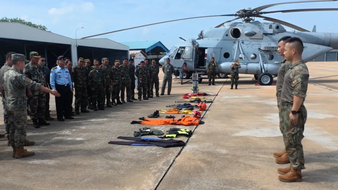 5月18日,中柬“金龙-2025”联演期间,中方参演部队位柬埔寨某空军基地开展搜救直升机装备展示及交流活动。图为中方参演部队展示救生装具(南部战区)