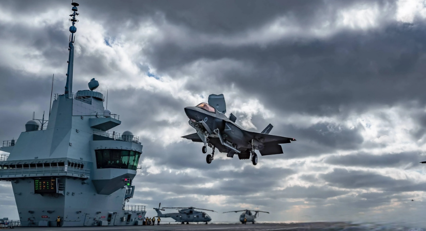 F-35B战斗机滑行距离短,可垂直起降,一般被部署在航空母舰上。目前有几架部署在“威尔士亲王”号航空母舰上。