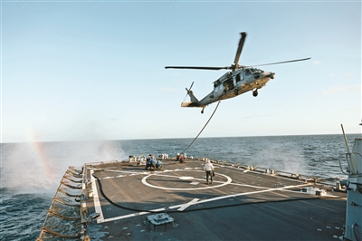 今年1月,美国海军一艘驱逐舰柯蒂斯·威尔伯号与一架MH-60S“海鹰”直升机共同参加了一次训练。训练中,MH-60S“海鹰”先在直升机平台上方与军舰保持相对静止状态,然后放下绞车,吊起加油软管,完成了由驱逐舰向直升机加油的过程。