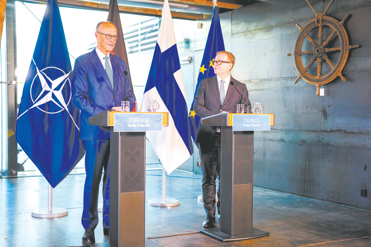 据“德国之声”报道,德国总理默茨(左)27日在芬兰表示,德国和欧盟将加大对俄施压,以促使其回到谈判桌前。(视觉中国)