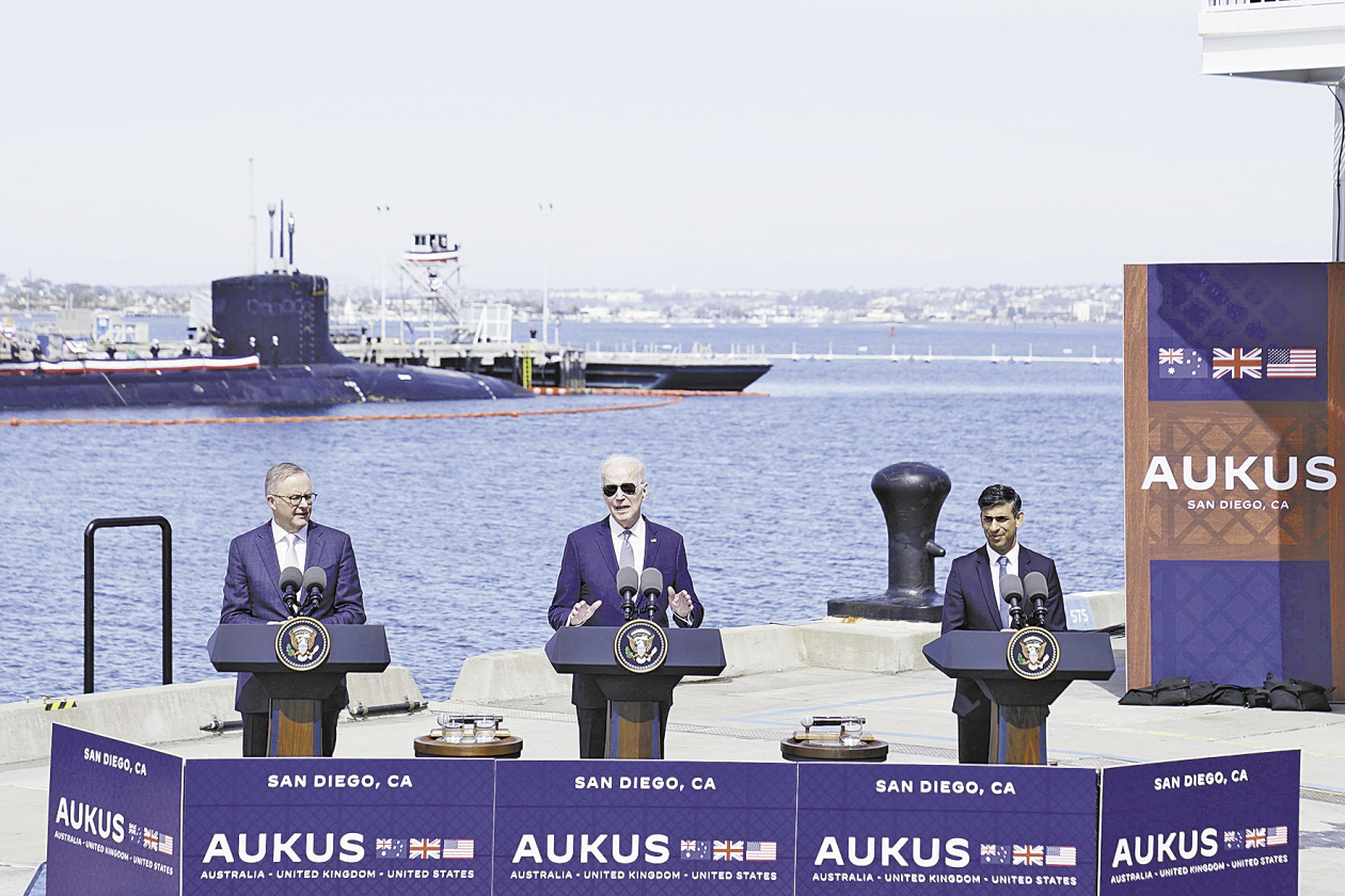 2023年3月13日,美国时任总统拜登、英国时任首相苏纳克和澳大利亚总理阿尔巴尼斯在美国圣迭戈海军基地就“奥库斯”举行会谈。(视觉中国)