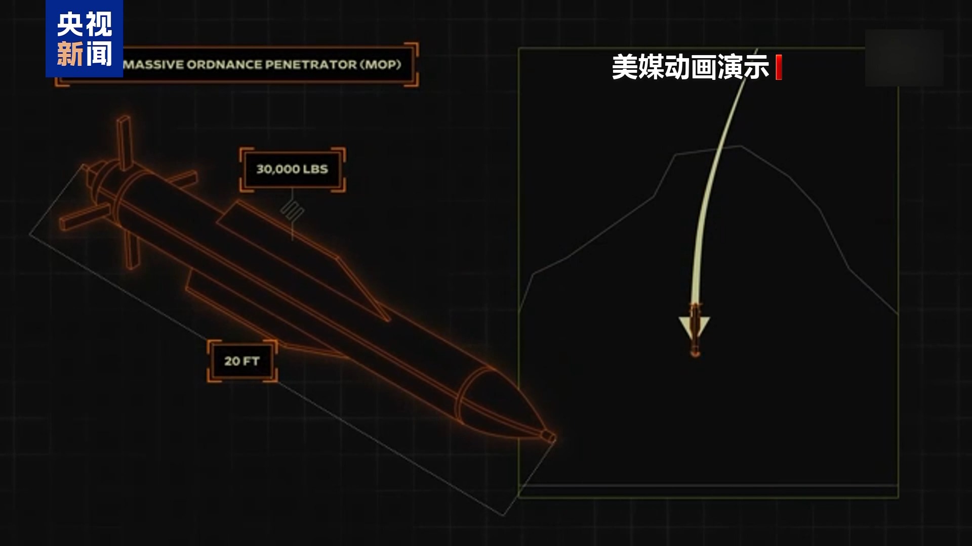 据《华尔街日报》介绍,GBU-57型钻地弹属于重型钻地炸弹,长20英尺,约合6米多;重30000磅,约合13.6吨;是世界上仅次于核武器的“最大威力炸弹”,可以摧毁深埋在地下的目标,因此又被称作“地堡炸弹”。GBU-57型钻地弹可以穿透的地下深度约200英尺,约合61米;主要由B-2A型隐形轰炸机携带,一次可携带两枚。GBU-57型钻地弹配备先进的导航系统以锁定目标,同时可在穿透地面到达一定深度后再引爆。