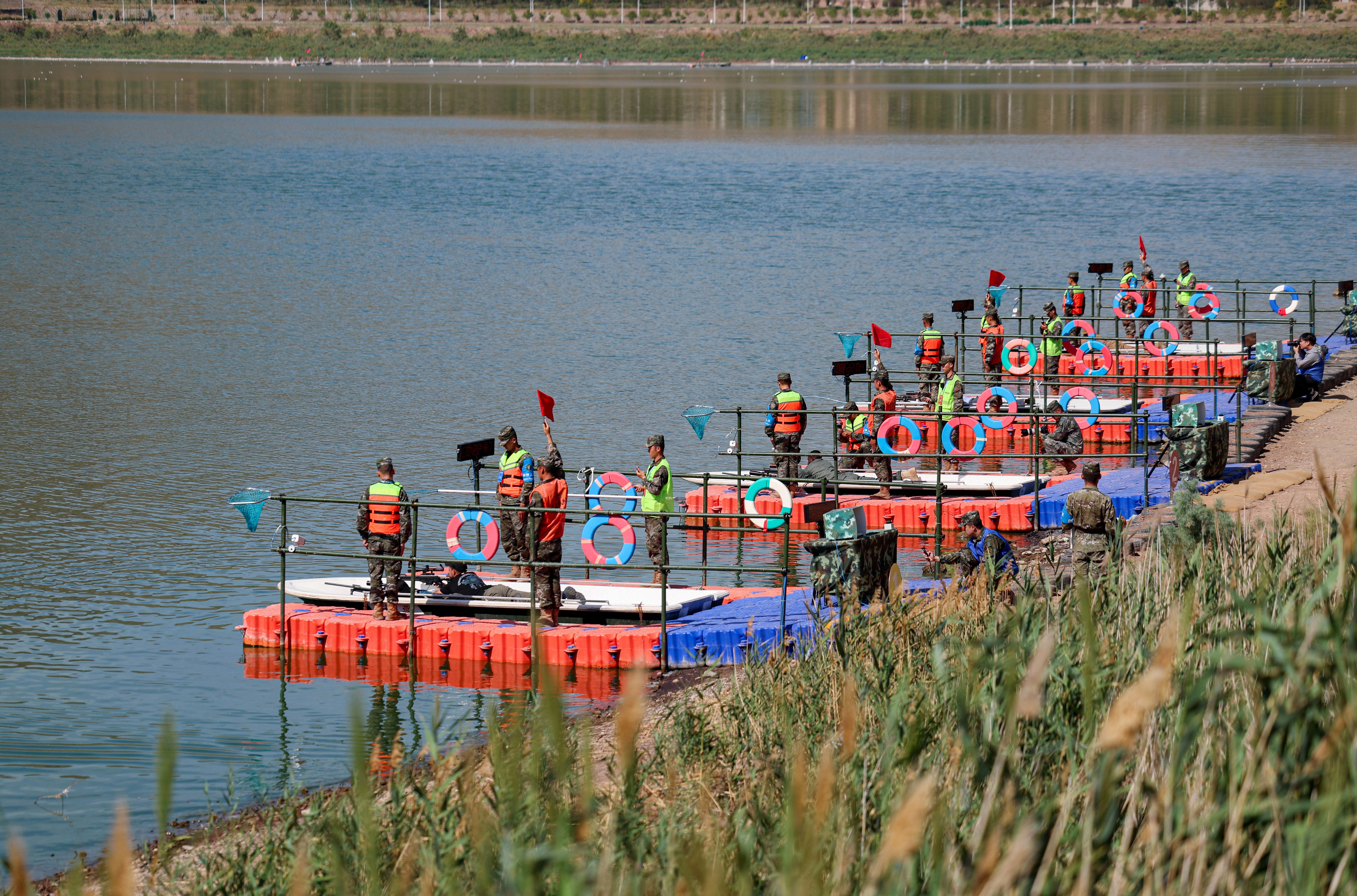 7月16日上午,在位于新疆乌鲁木齐的武警部队某训练基地,参加“锋刃-2025”国际狙击手射击竞赛的各国参赛队员展开激烈角逐。图为各国参赛队员进行“搭乘舟艇水上狙击”课目竞赛。侯崇慧 摄