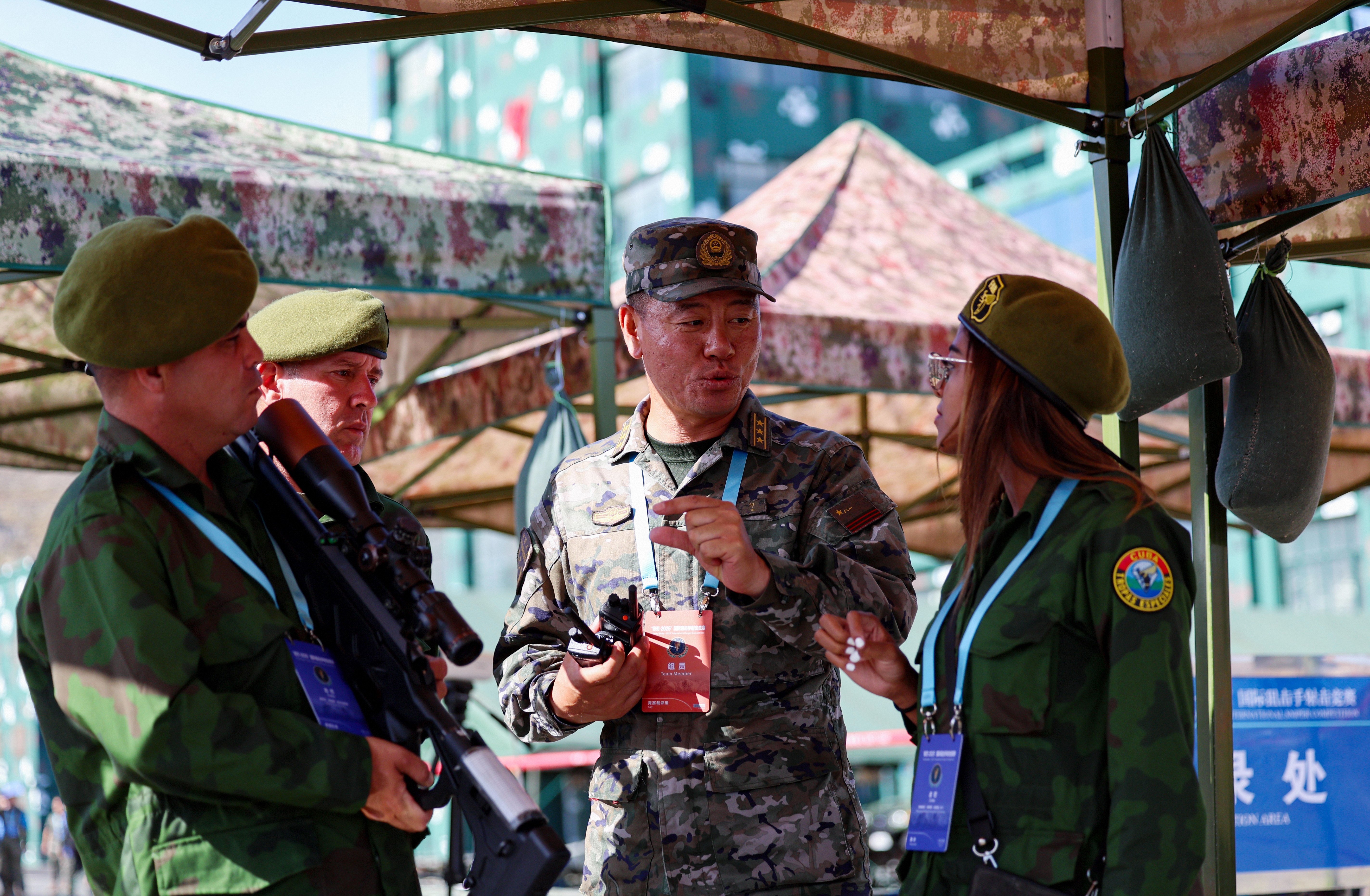 7月16日上午,在位于新疆乌鲁木齐的武警部队某训练基地,参加“锋刃-2025”国际狙击手射击竞赛的各国参赛队员展开激烈角逐。图为工作人员与古巴参赛队员交流射击心得。侯崇慧 摄