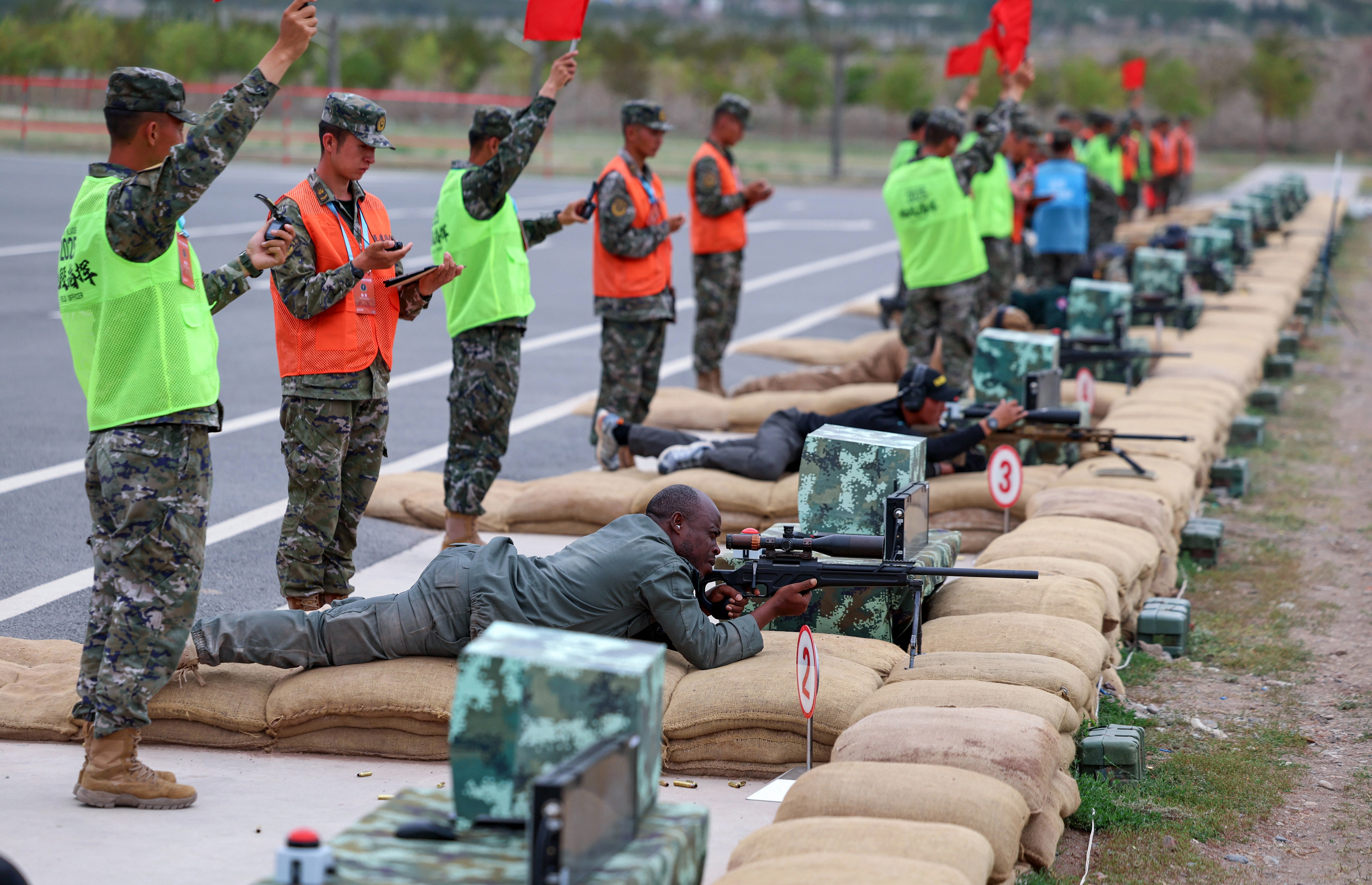 7月15日下午,在位于新疆乌鲁木齐的武警部队某训练基地,参加“锋刃-2025”国际狙击手射击竞赛的各国参赛队员展开激烈角逐。图为各国参赛队员进行“百步穿杨”课目竞赛。侯崇慧 摄
