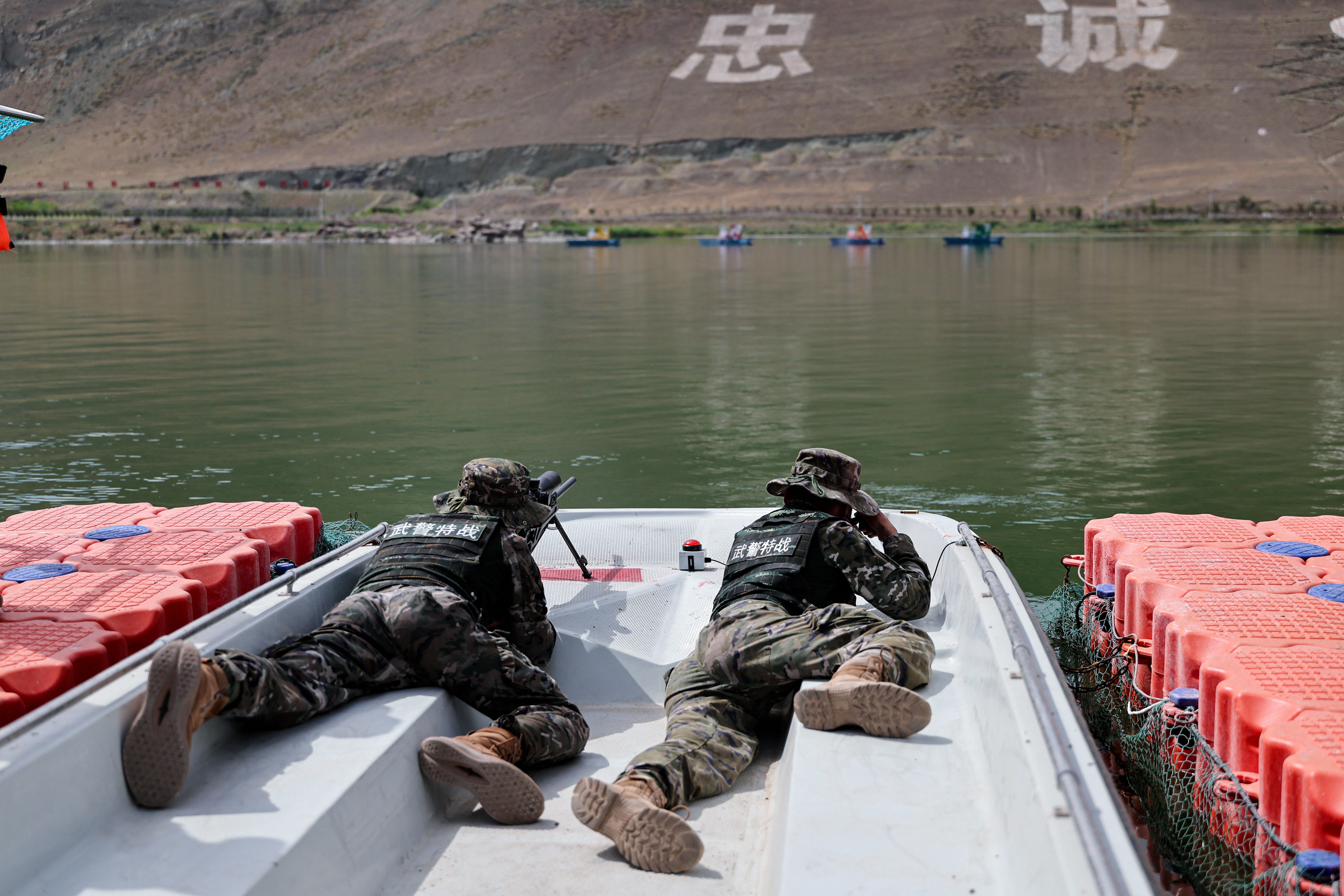 7月16日上午,在位于新疆乌鲁木齐的武警部队某训练基地,参加“锋刃-2025”国际狙击手射击竞赛的各国参赛队员展开激烈角逐。图为中国参赛队员进行“搭乘舟艇水上狙击”课目竞赛。侯崇慧 摄