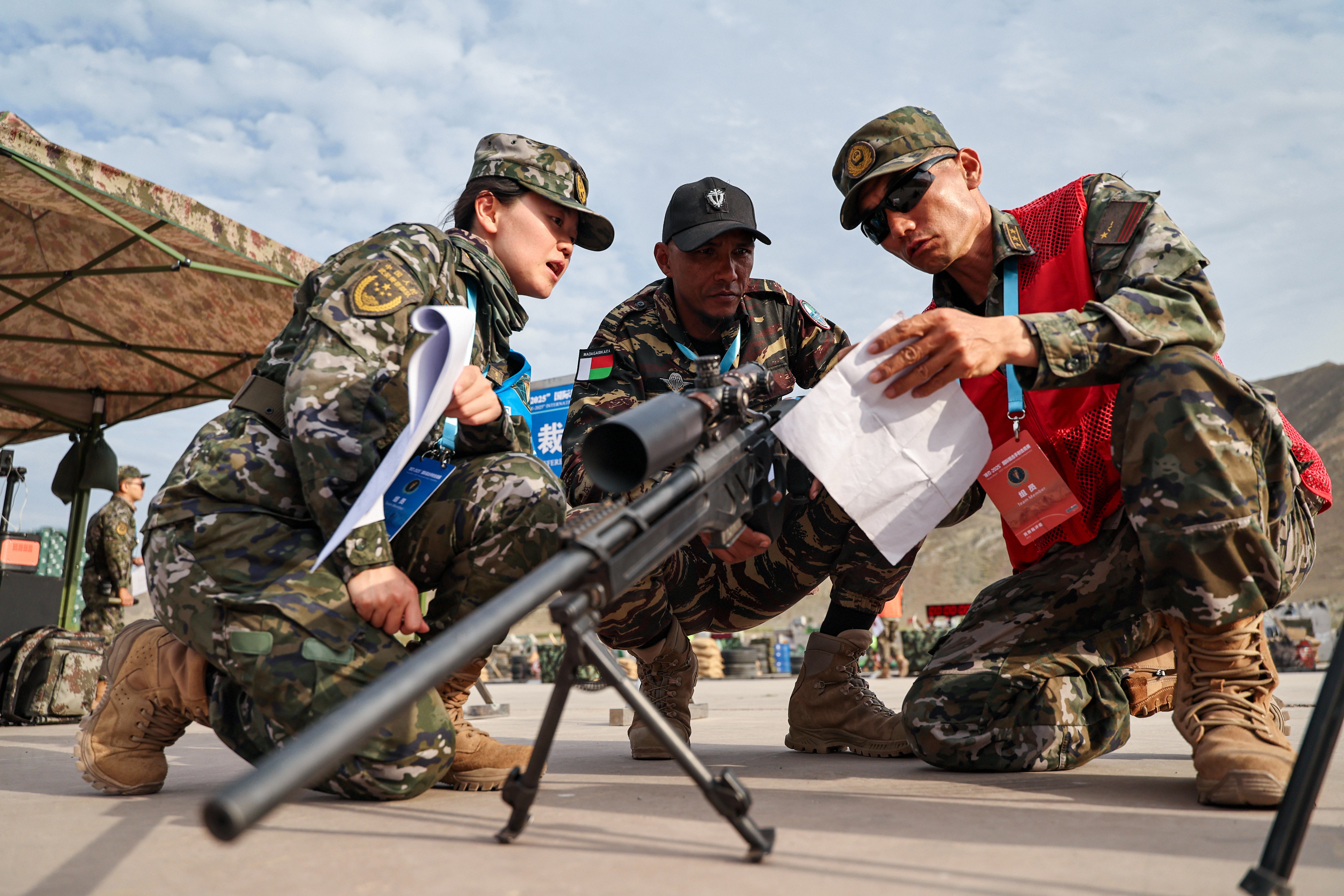 7月15日下午,在位于新疆乌鲁木齐的武警部队某训练基地,参加“锋刃-2025”国际狙击手射击竞赛的各国参赛队员展开激烈角逐。图为工作人员向马达加斯加参赛队员介绍武器性能。侯崇慧 摄