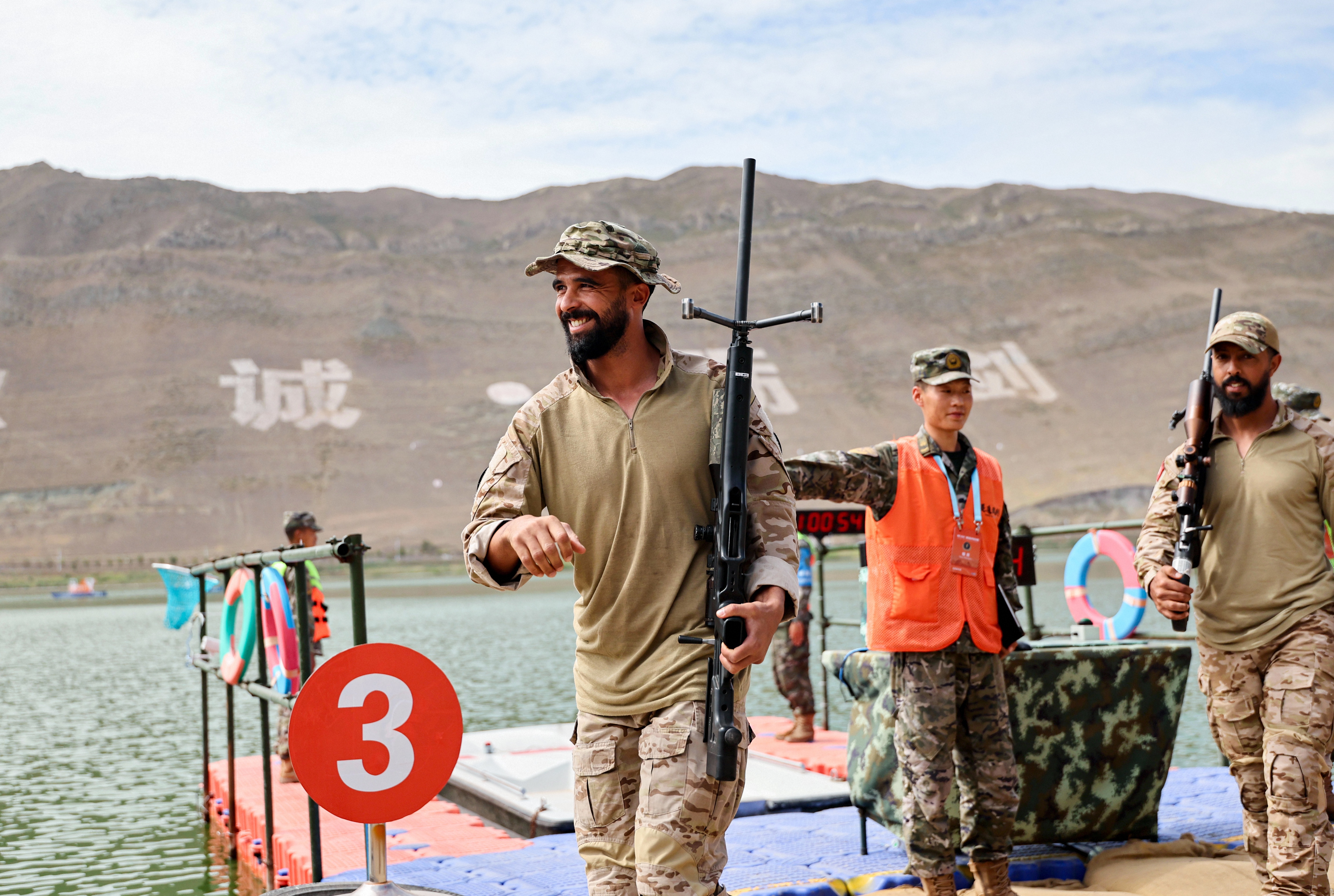 7月16日上午,在位于新疆乌鲁木齐的武警部队某训练基地,参加“锋刃-2025”国际狙击手射击竞赛的各国参赛队员展开激烈角逐。图为突尼斯参赛队员在“搭乘舟艇水上狙击”课目竞赛中自信走下赛场。侯崇慧 摄