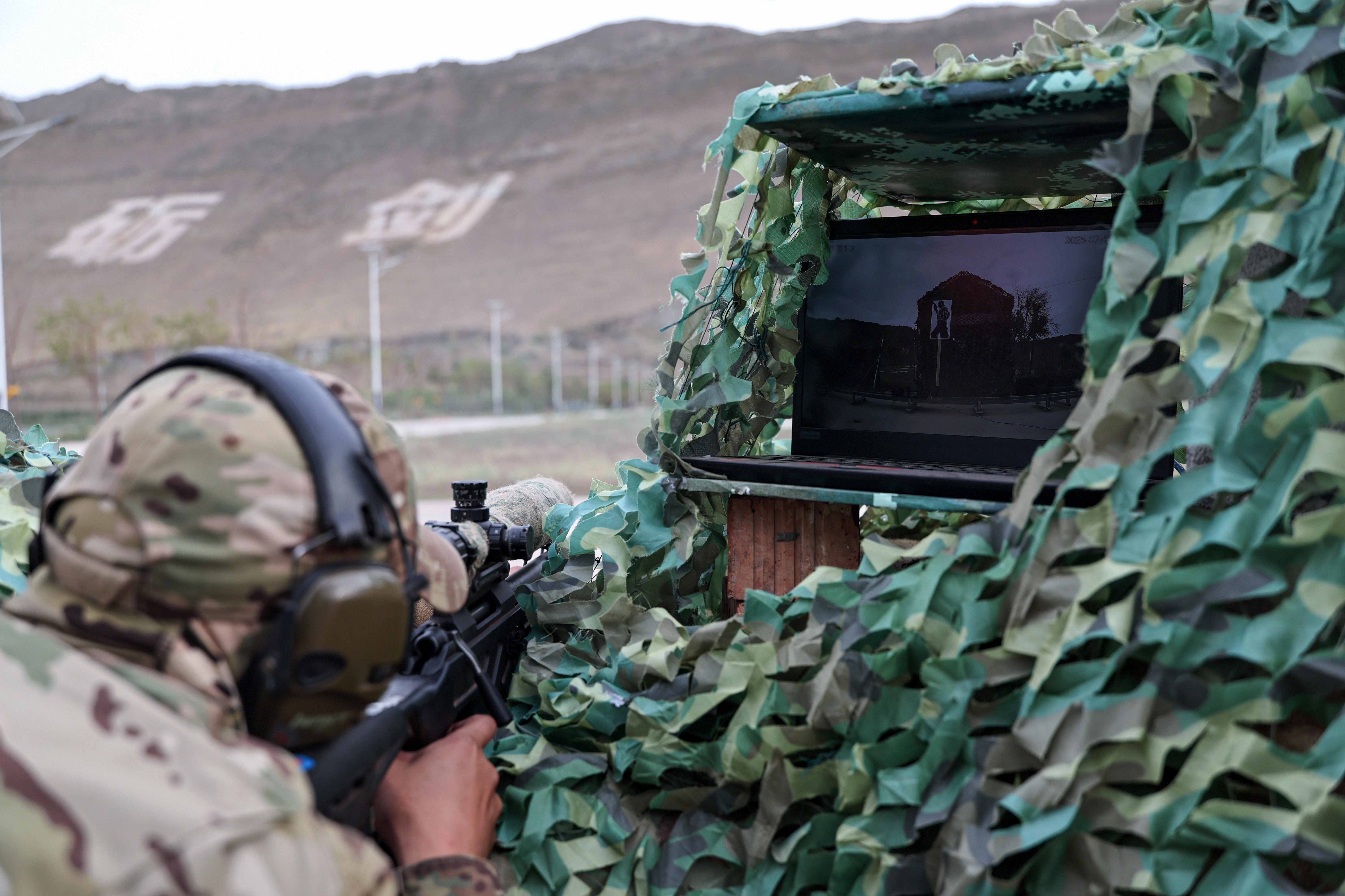 7月15日下午,在位于新疆乌鲁木齐的武警部队某训练基地,参加“锋刃-2025”国际狙击手射击竞赛的各国参赛队员展开激烈角逐。图为蒙古国参赛队员进行“人机协同隔障狙击”课目竞赛。侯崇慧 摄
