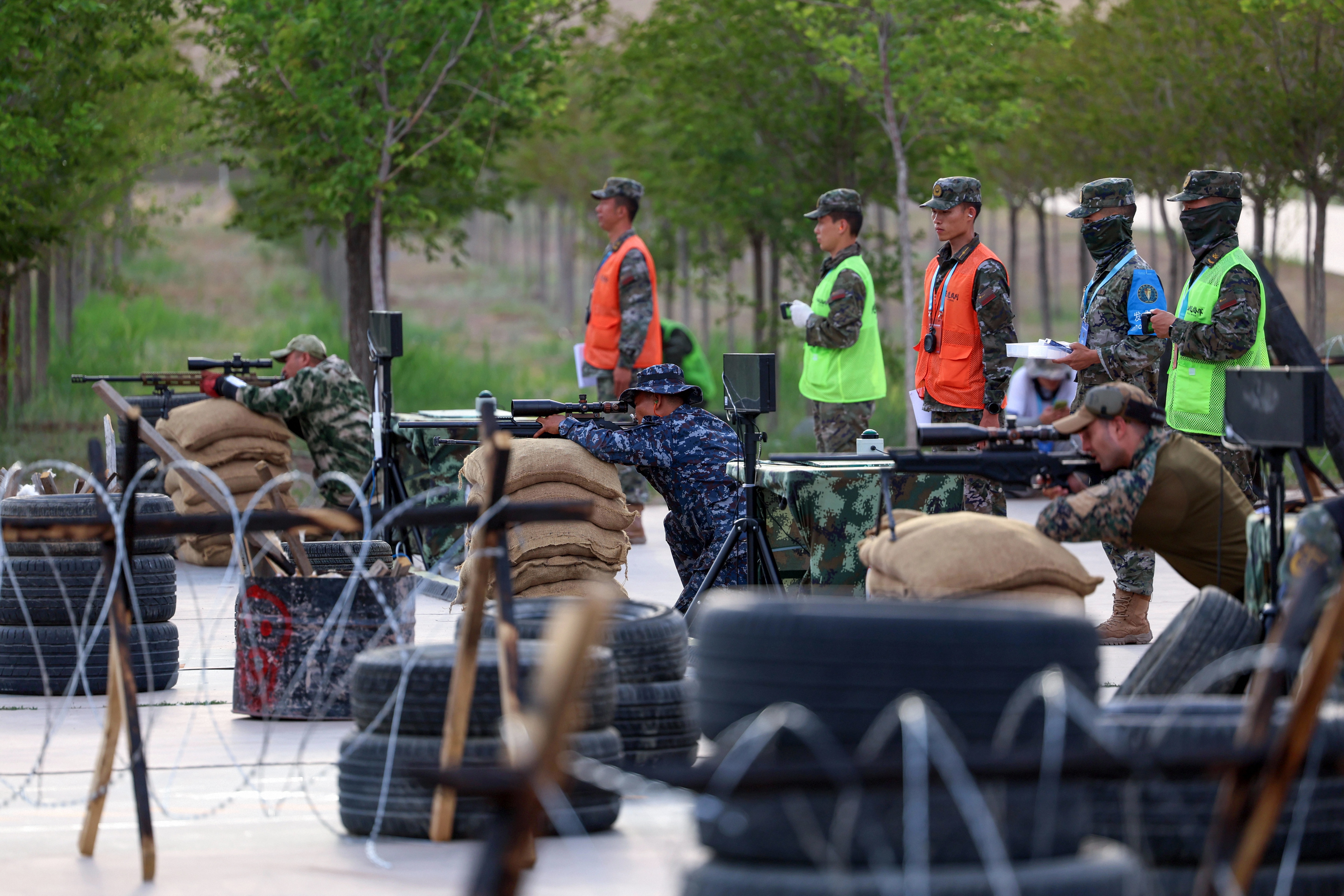 7月15日下午,在位于新疆乌鲁木齐的武警部队某训练基地,参加“锋刃-2025”国际狙击手射击竞赛的各国参赛队员展开激烈角逐。图为各国参赛队员进行“筑垒御敌”课目竞赛。侯崇慧 摄