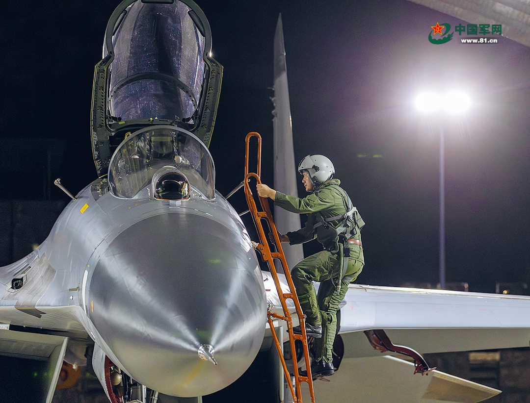 深夜,皓月当空,繁星点点。空军某部机场灯火通明、战鹰列阵,保障车辆来回穿梭。“计时起飞!”一声令下,战机依次起飞,直插夜空。