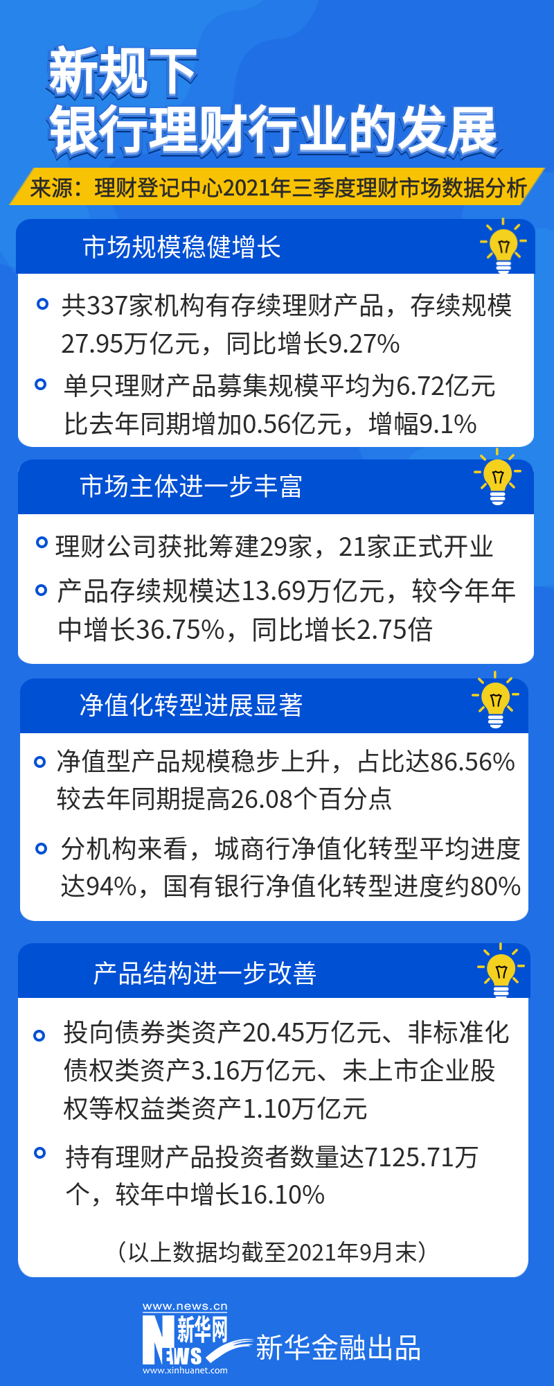 根据银行业理财登记托管中心发布的2021年三季度理财市场数据显示,截至9月底,银行理财市场存续规模达27.95万亿元,同比增长9.27%,市场运行平稳。产品运作模式由具有混同运作特征的“预期收益型”全面转向资产与产品清晰对应的“净值型”。