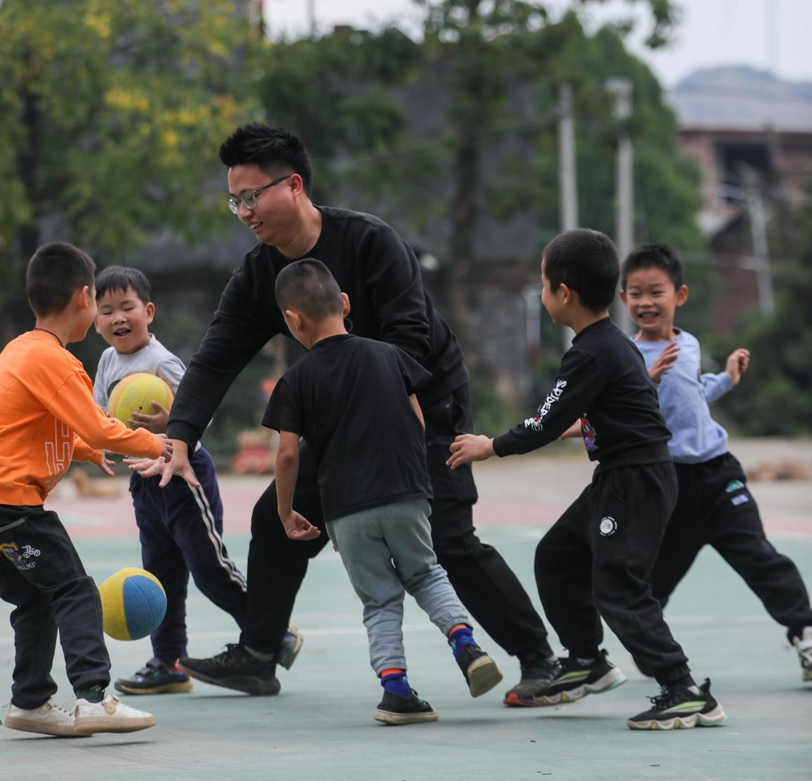 通过争取专项资金,工作队为赤卫村修建了篮球场和羽毛球场,工作队成员有空就会来球场争当“大龄”孩子王 朱辉峰摄