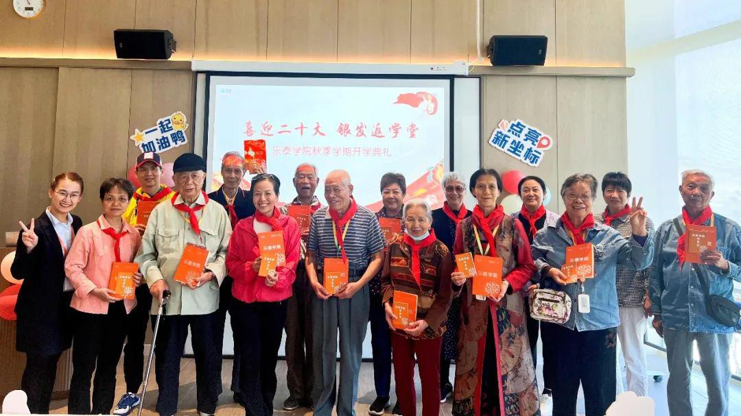 桂园入住居民的首批学员们举行开学仪式,戴上红领巾、发放乐泰学院学员证及笔记本,开启新学期新征程,一起重返银发学堂。各位叔叔阿姨正式开启了乐泰学院新学期的校园生活,祝愿长辈们在桂园“开启新篇章,继续乘风破浪。”