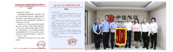 2022年全年,中信银行“哨兵”智能反欺诈系统通过电话核实、弹窗警示、交易阻断等机制,主动劝阻被诈骗客户860人,拦截资金1.12亿元;查控涉赌涉诈账户2.34万户,管控资金2.65亿元。由于在警银协作反诈过程中的突出表现,中信银行各地分行在帮助客户阻断金融诈骗后,受到当地公安机关的表扬或感谢,对中信银行在打击治理电信网络新型违法犯罪方面的积极配合表示肯定。