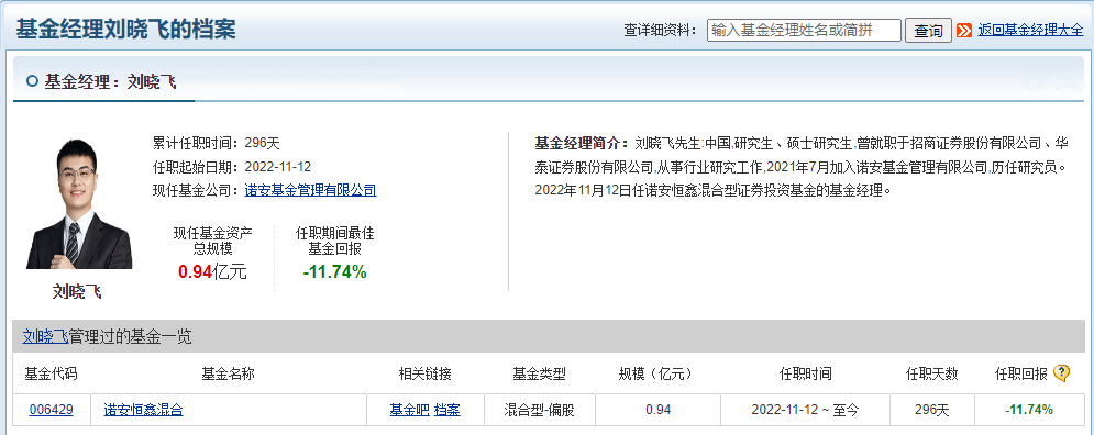 值得注意的是,诺安恒鑫混合共管基金经理为刘晓飞,于2022年11月开始共管诺安恒鑫混合,任职回报为-11.74%。
