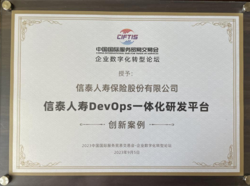9月5日,2023中国国际服务贸易交易会“企业数字化转型论坛”在北京举办,信泰人寿保险股份有限公司(下称“信泰保险”)申报的“一站式DevOps研发协同平台项目”获数智影响力-创新案例奖。