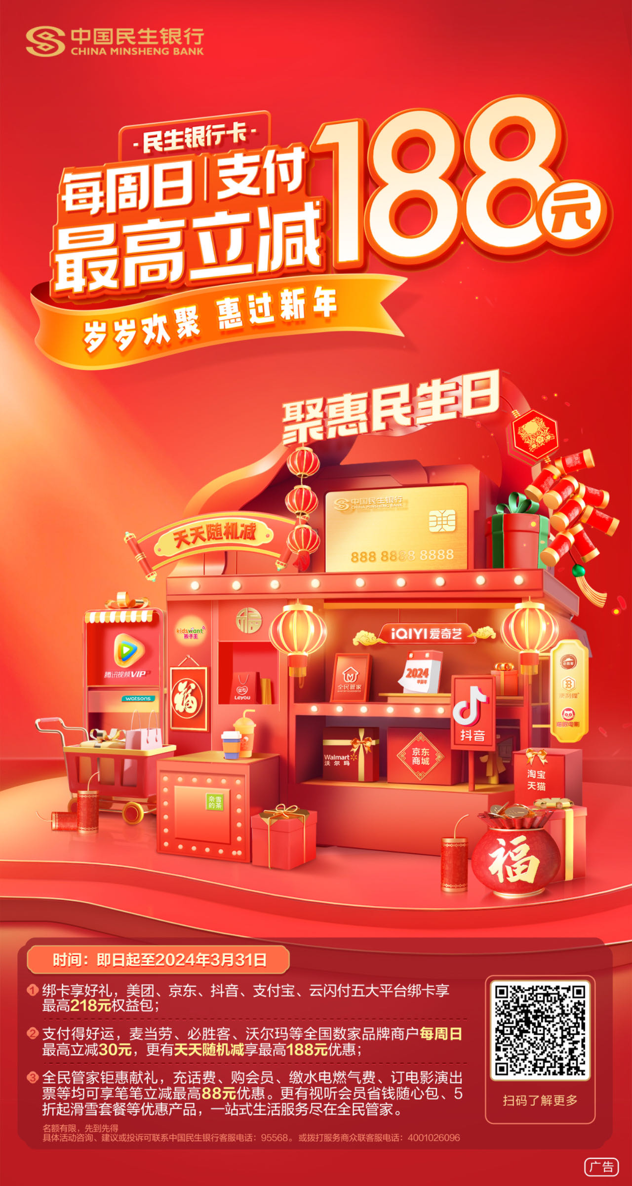 “聚惠民生日”是民生信用卡中心近两年重点打造的支付品牌,聚焦客户吃喝娱购等消费需求,覆盖电商平台、餐饮饮品、大型商超、休闲文娱、亲子母婴、车主用车、便利店等七大客户高频消费场景,线上与京东、淘宝等头部平台达成长期合作,线下甄选喜茶、必胜客、沃尔玛、孩子王、等众多大型连锁品牌开展支付满额立减活动,目前已覆盖全国近80,000家门店,获得了客户和商户的双重认可,形成了良好的市场口碑。(品宣)