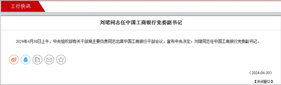 新华网北京4月30日电(刘睿祎)据中国工商银行官方网站消息,4月30日,中央组织部有关干部局主要负责同志出席中国工商银行干部会议,宣布中央决定:刘珺同志任中国工商银行党委副书记。