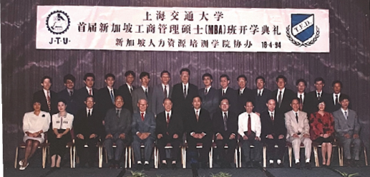 1993年,上海交通大学管理学院率先在新加坡开办海外MBA项目,成为中国第一家“走出去”的商学院,图为1994年4月上海交通大学首届新加坡工商管理硕士(MBA)班开学典礼。