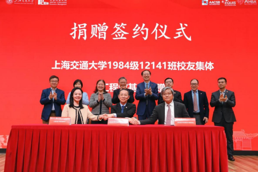 学院广大校友积极践行饮水思源校训,关心支持学院发展建设,图为2023年4月上海交通大学原管理学院1984级12141班开展工程馆基金捐赠。