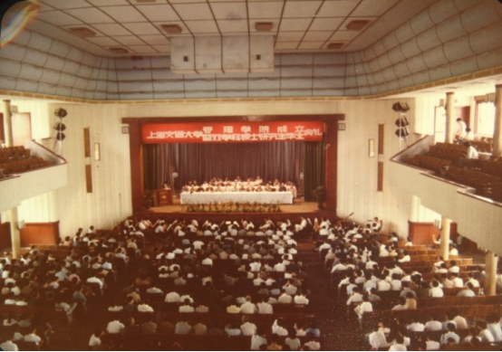 1984年4月,作为首批四所高校之一,教育部正式批复同意上海交通大学设立管理学院,开启了学校管理学科发展的新篇章,图为同年6月在徐汇校区文治堂举行的上海交通大学管理学院成立典礼。