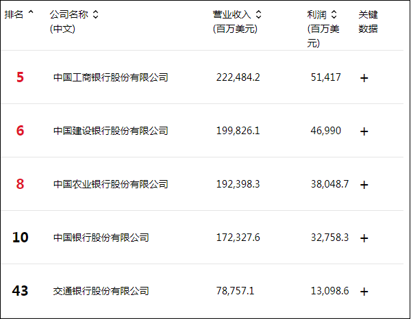 四家国有大行在排行榜中的排名接近,工商银行、建设银行与农业银行分别位居第5、第6和第8,中国银行位居第10。