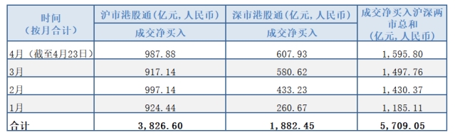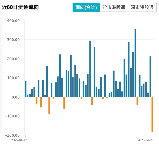 2024年,南向资金净流入8078.7亿港元,刷新历史纪录;2025年,南向资金流入势头只增不减,从月度数据来看,1至4月南向资金净买入分别为1185.11亿元、1430.37亿元、1497.76亿元和1595.80亿元,逐月持续递增。值得注意的是,4月23日南向资金全天成交额约为1216亿元,成交净卖出170.84亿元,是今年以来较大幅度的单日净卖出。