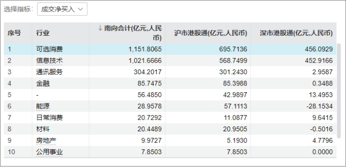 从行业数据来看,可选消费和信息技术行业成为资金集中布局方向,南向资金净买入均超1000亿元人民币。此外,通讯技术、金融、能源、日常消费等行业也受到沪市南向资金青睐。这种分化或与投资者结构相关,沪市以机构为主,偏好稳定价值股;深市包含更多中小投资者,对高弹性板块关注度更高。