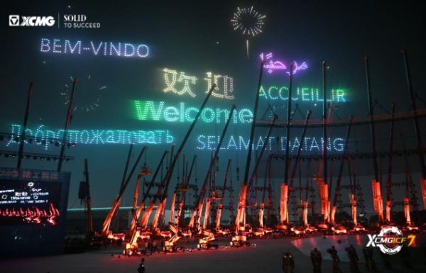 2000架无人机以多种语言展示欢迎词,通过不停变换的徐工元素、徐州文旅元素突出徐州工程机械夜文化特色,编织了一幅“助建绿色美好未来”的壮美画卷。