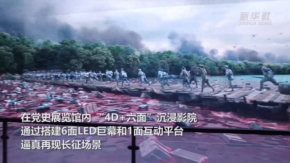 在展览馆内,“4D+六面“沉浸影院通过搭建6面LED巨幕和1面互动平台,逼真再现长征场景,展现了长征途中血战湘江,强渡乌江,飞夺泸定桥,爬雪山,过草地等过程,通过自主研发的智慧云中控系统,可触发风、雪、冷气等环境模拟,使观众有身临其境的观影体验。