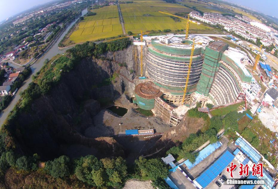 11月1日,位于上海市松江区的“深坑酒店”主体结构、格局初现。建设者正在抓紧时间工作。据了解,“深坑酒店”选址在旧矿场形成的深坑,建成后酒店将拥有近400间客房,包括地上2层和地下16层,最底下的2层建筑为水下建筑。殷立勤 摄
