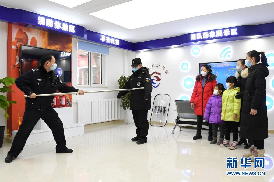 1月10日,在北京市公安局海淀分局永定路派出所第三社区警务工作站展示区,社区民警屈超直(左一)与安保人员向社区居民展示警用装备的用法。
