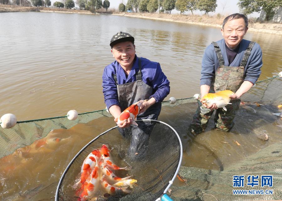 1月19日,在浙江省湖州市安吉县递铺街道一家养鱼场内,养殖户展示收获的精品锦鲤。